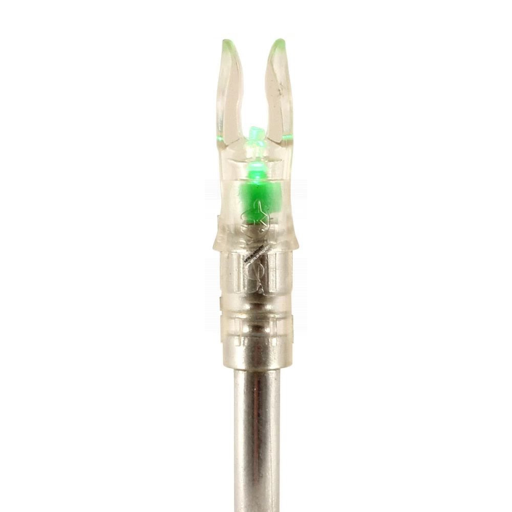 Inside the Nightfire Nock there is a micro switch which activates when the arrow is released. The nock is later deactivated by means of an arrow tip or the included metal pin. There is a small opening on the side of the nock for this purpose.